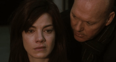 Knorren med Saras blindhet utnyttjas förstås enligt konstens alla klyschor, vilket också innebär att kameran även ger sig på att luras med oss som tittar. Men naturligtvis innebär dagens standardmanus också att det hjälplösa offret framåt finalen plötsligt förvandlas till värsta handlingskraftiga och stenhårda hjältinnan. Monaghan spelar ändock på bra med sitt handikapp och matchas ganska smutt av gamle Michael Keaton (yes där har ni den andra ingrediensen i mixen som beskrevs ovan) som den smoothtalkande psykopaten Hollander. Lite äldre, lite tunnhårigare, lite trindare, men samma stundtals pigga ögon. Han gör sig i badassroller, gamle Batman. Den otrevlige och knivälskande Chad (Barry Sloane) utgör den tredje parten i detta…tja..typ av kammarspel.